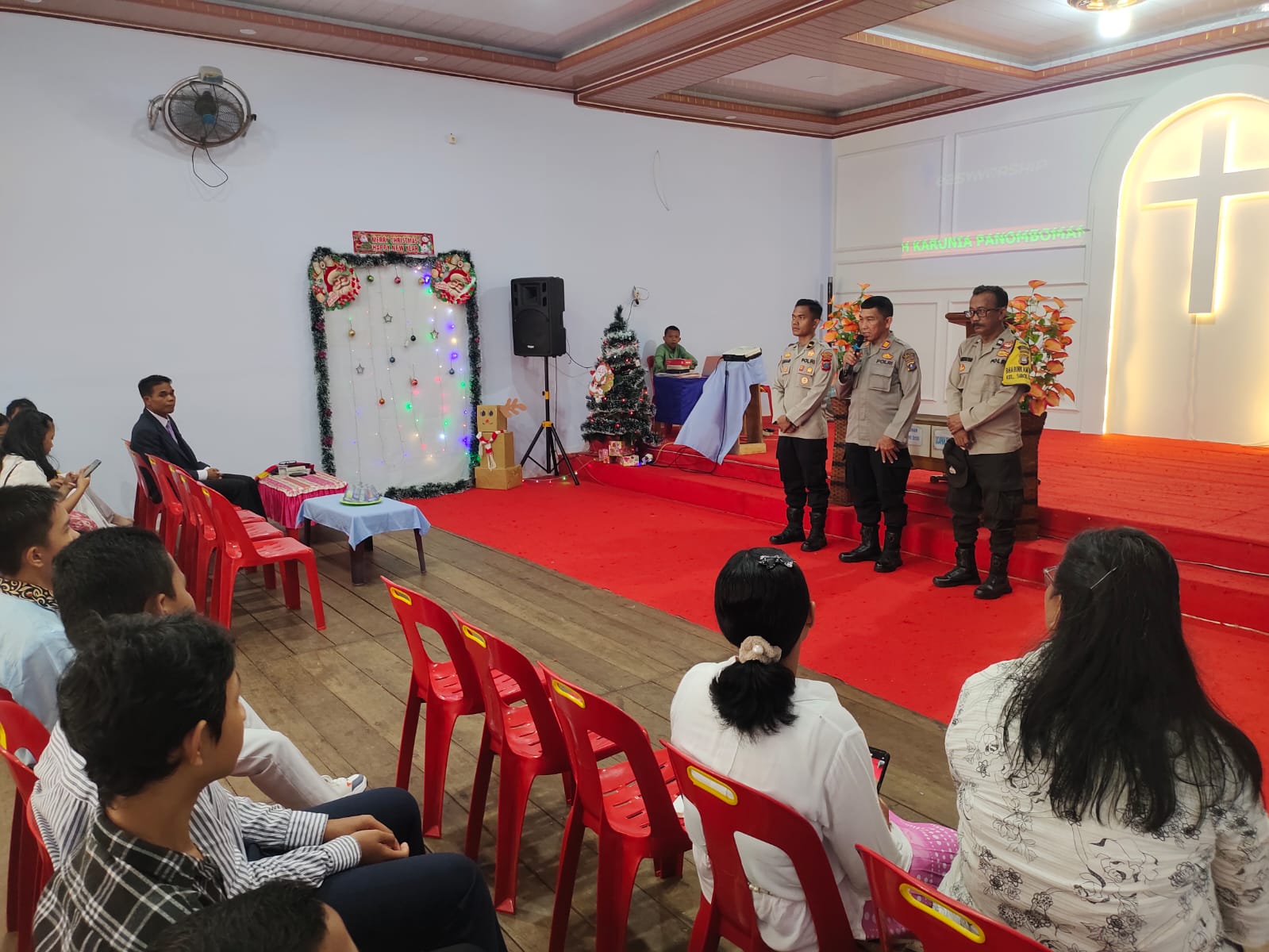 Dalam kesempatan tersebut, Kasat Binmas Polres Sibolga menyampaikan berbagai himbauan dan pesan-pesan Kamtibmas kepada jemaat. Disampaikan bahwa Polres Sibolga saat ini terus melaksanakan sejumlah program rutin, di antaranya Program Minggu Kasih, pengamanan ibadah kebaktian Minggu, serta Patroli Tiga Pilar yang dilaksanakan setiap malam hari guna menciptakan situasi Kamtibmas yang aman dan kondusif di wilayah Kota Sibolga.