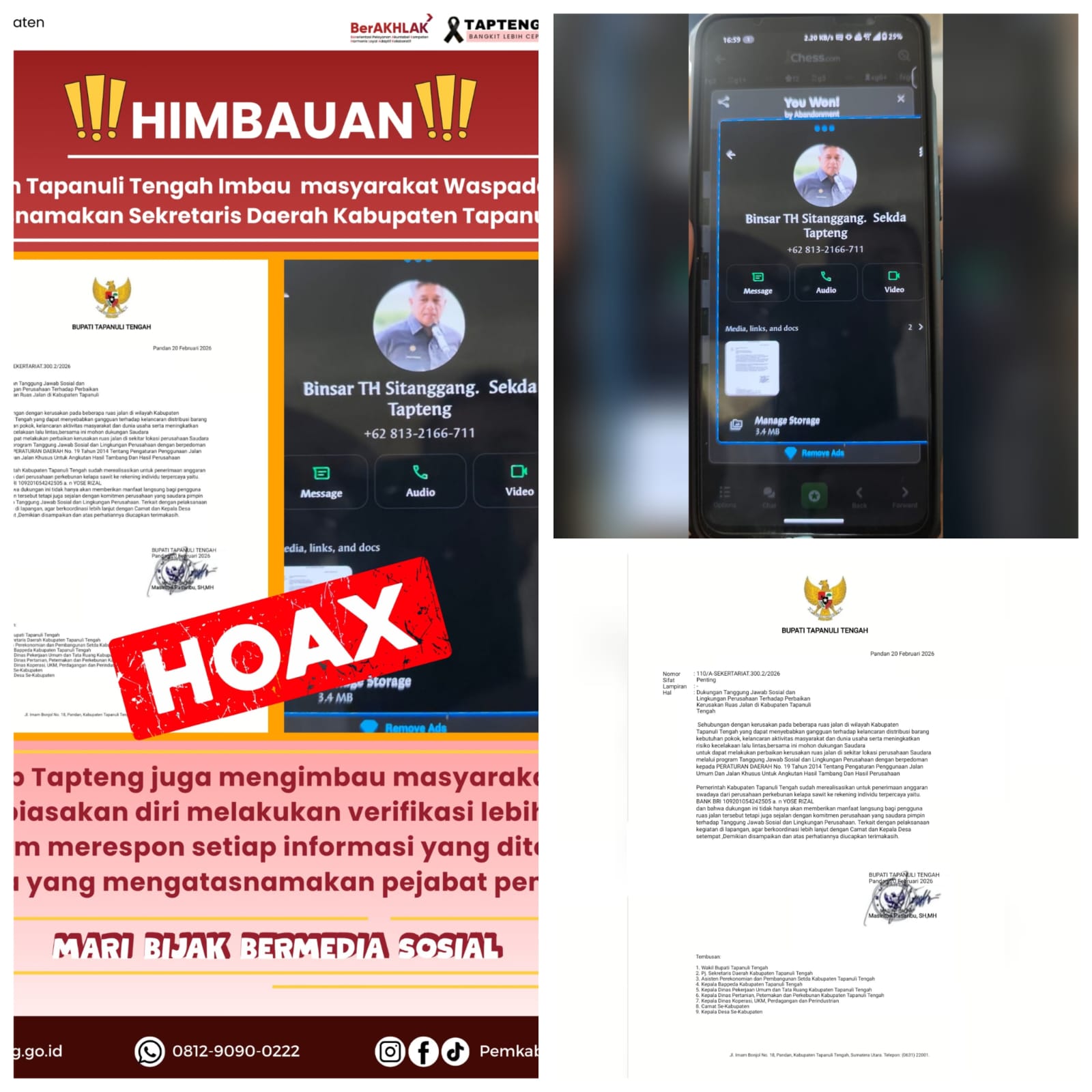 Kami tegaskan akun yang mengatasnamakan Sekdakab Tapteng Drs. Binsar TH Sitanggang, M.SP, adalah tidak benar. Itu adalah hoaks dan bukan nomor ponsel milik saya pribadi. Kami mengimbau masyarakat agar berhati-hati, jangan menanggapi pesan serupa yang mengatasnamakan Sekdakab Tapteng.Kami juga mengimbau masyarakat agar membiasakan diri melakukan verifikasi lebih dulu sebelum merespon setiap informasi yang diterima, terutama yang mengatasnamakan pejabat pemerintah.”pungkas Sekdakab Tapteng