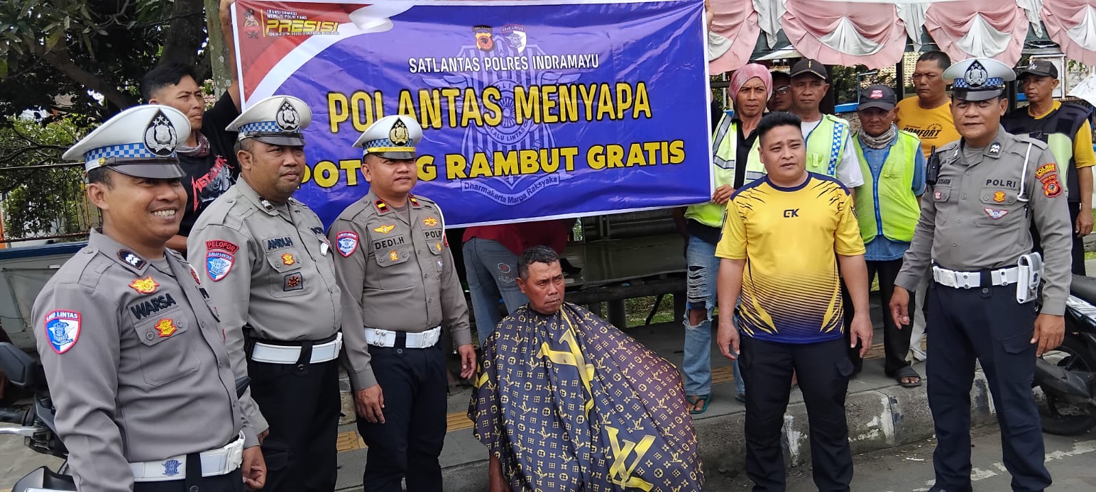 Satuan Lantas (Satlantas) Polres Indramayu Unit Keamanan dan Keselamatan (Kamsel) Mengadakan Bakti Sosial dengan Melaksanakan Potong Rambut Gratis Dengan Menggandeng Pangkas Rambut RT Milik Sohibul Wasilah Warga Kelurahan Paoman.