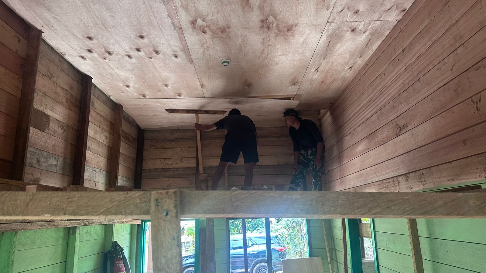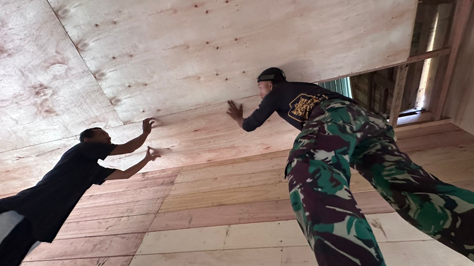 Pemasangan plafon tersebut dilakukan secara gotong royong antara anggota Satgas TMMD dan masyarakat setempat. Dengan penuh semangat kebersamaan, mereka bahu-membahu mengangkat dan memasang rangka serta papan plafon agar rumah yang sedang dibangun dapat segera ditempati dengan lebih nyaman oleh pemiliknya.