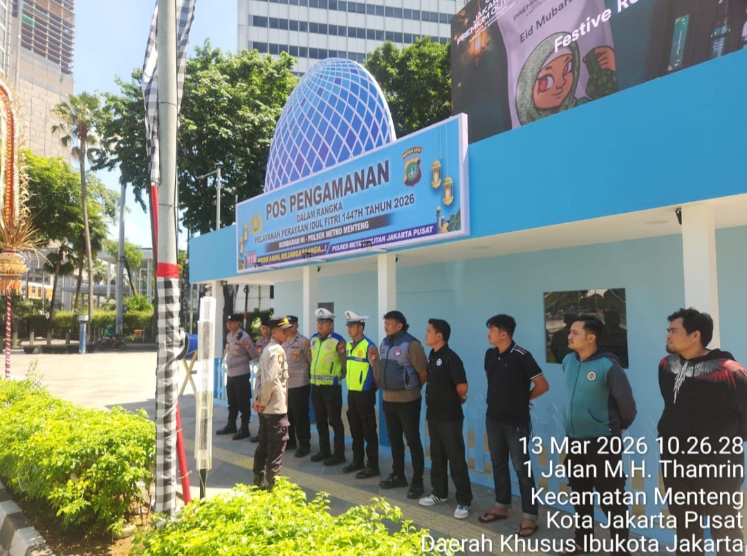 detikhukum.id,- Jakarta Pusat – Dalam rangka menjaga keamanan dan ketertiban masyarakat selama arus mudik dan perayaan Idulfitri, jajaran Polsek Metro Menteng melaksanakan kegiatan pengamanan Pos Pengamanan (Pospam) Operasi Ketupat Jaya 2026 di kawasan Bundaran Hotel Indonesia (HI), Jalan MH Thamrin, Menteng, Jakarta Pusat. Kegiatan tersebut dipimpin langsung oleh Kapospam IPtu Agung Sukiswo dengan melibatkan perkuatan sebanyak 11 personel gabungan yang disiagakan untuk mengantisipasi berbagai potensi gangguan kamtibmas di pusat aktivitas masyarakat tersebut. Jumat (13/3/2026)