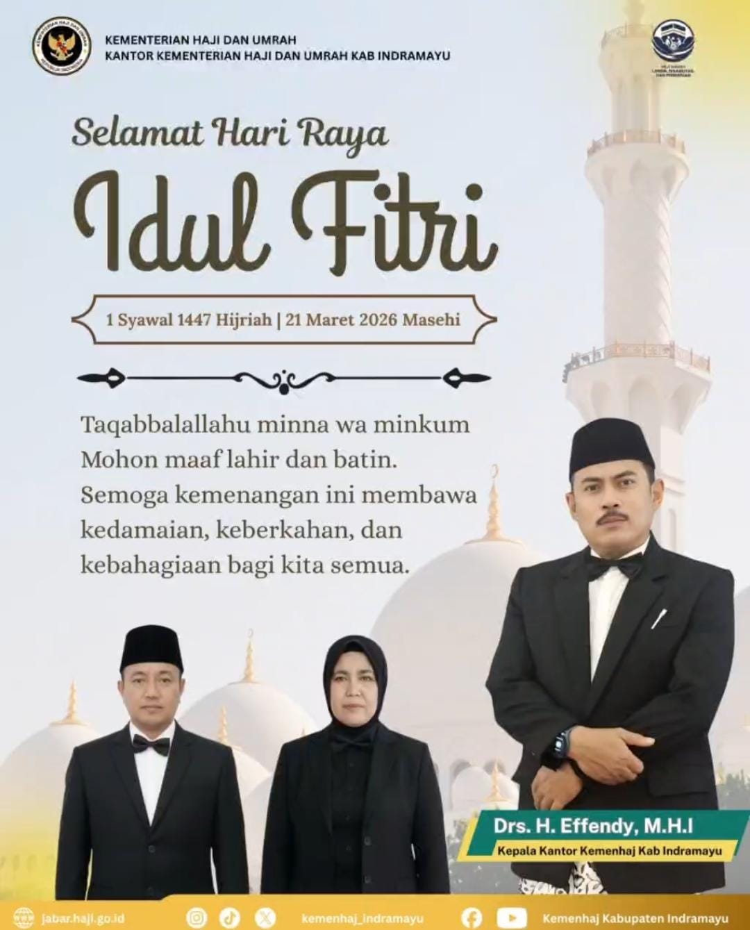 Dalam rangka menyambut Hari Raya Idul Fitri 1 Syawal 1447 Hijriah atau tahun 2026 Masehi, Kepala Kantor Kementerian Haji dan Umroh (KakanKemenHaj Dan Umroh) Kabupaten Indramayu Drs H. Effendy M.Hi menyampaikan ucapan selamat Hari Raya Idulfitri 1447 H kepada seluruh masyarakat.