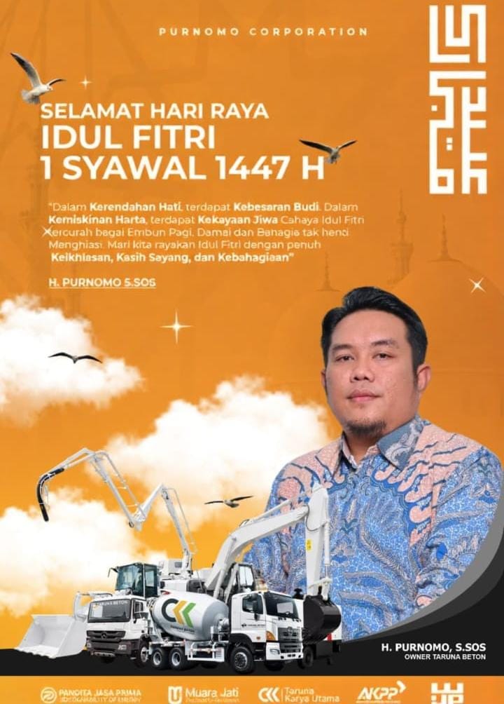 Dalam rangka menyambut Hari Raya Idul Fitri 1 Syawal 1447 Hijriah atau tahun 2026 Masehi, H.Purnomo,S.Sos Owner Taruna Beton, menyampaikan ucapan selamat Hari Raya Idulfitri 1447 H kepada seluruh masyarakat.
