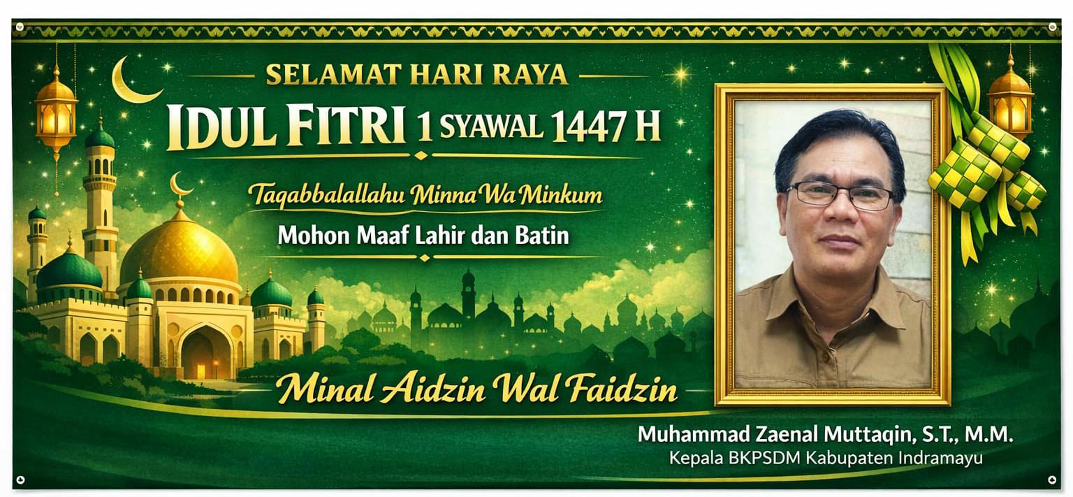 detikhukum.id,-:Indramayu,- Dalam rangka menyambut Hari Raya Idul Fitri 1 Syawal 1447 Hijriah atau tahun 2026 Masehi,Kepala Badan Kepegawaian dan Pengembangan Sumber Daya Manusia (BKPSDM) Kabupaten Indramayu Muhammad Zaenal Muttaqin, S.T., M.M Menyampaikan Ucapan Selamat Hari Raya Idulfitri kepada seluruh masyarakat.