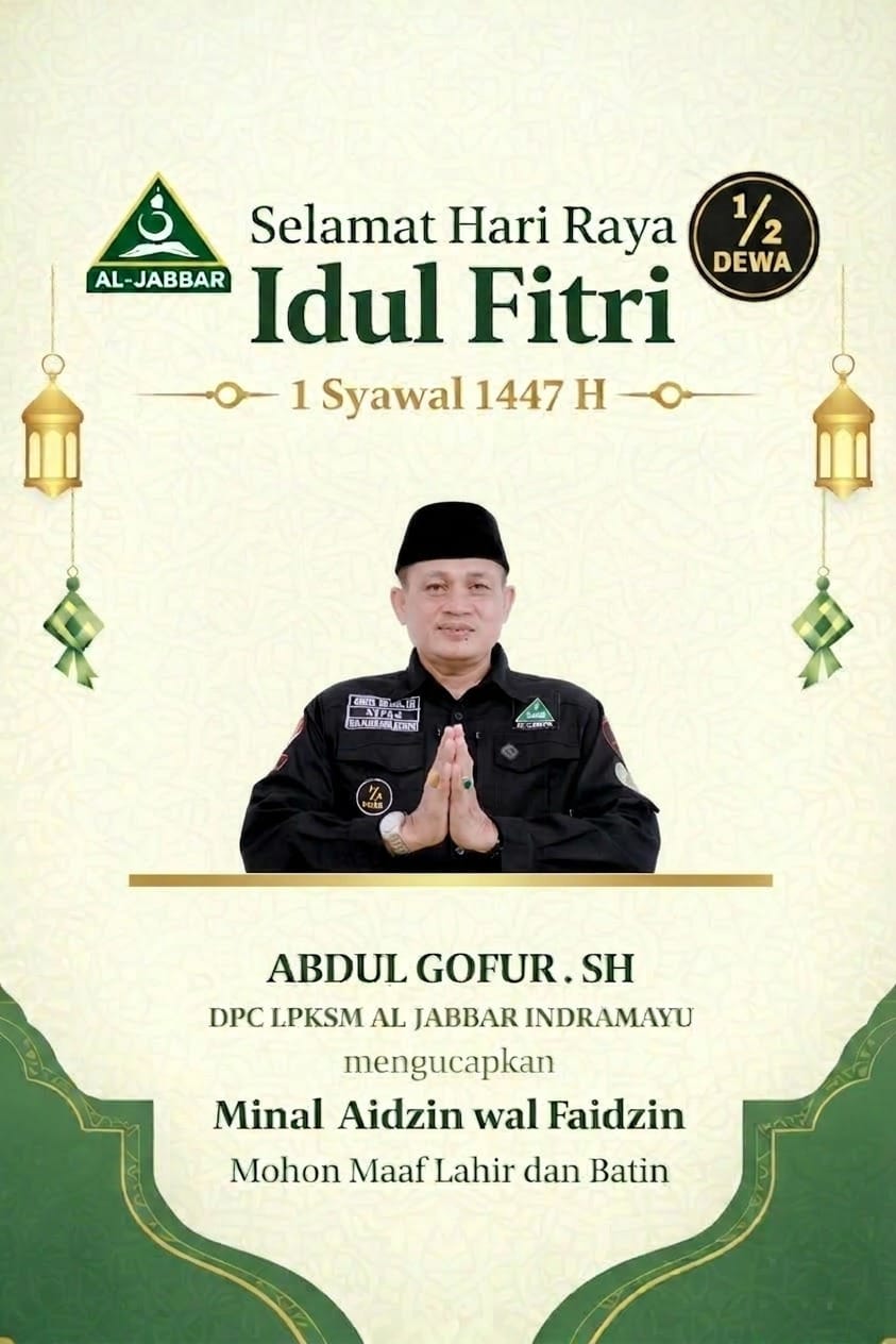Dalam rangka menyambut Hari Raya Idul Fitri 1 Syawal 1447 Hijriah atau tahun 2026 Masehi, Ketua Lembaga Perlindungan Konsumen Swadaya Masyarakat (LPKSM) Dewan Pimpinan Cabang (DPC) Al Jabbar Kabupaten Indramayu Abdul Gofur SH, menyampaikan ucapan selamat Hari Raya Idulfitri 1447 H kepada seluruh masyarakat.