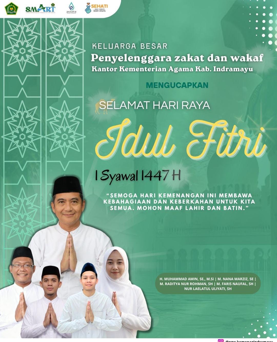 Dalam rangka menyambut Hari Raya Idul Fitri 1 Syawal 1447 Hijriah atau tahun 2026 Masehi, H.Muhammad Amin, S.E.,M.Si Kasie (Kepala Seksi) Penyelenggara Zakat dan Wakaf (PZW) Kemenag (Kementerian Agama) Indramayu, menyampaikan ucapan selamat Hari Raya Idulfitri 1447 H kepada seluruh masyarakat.