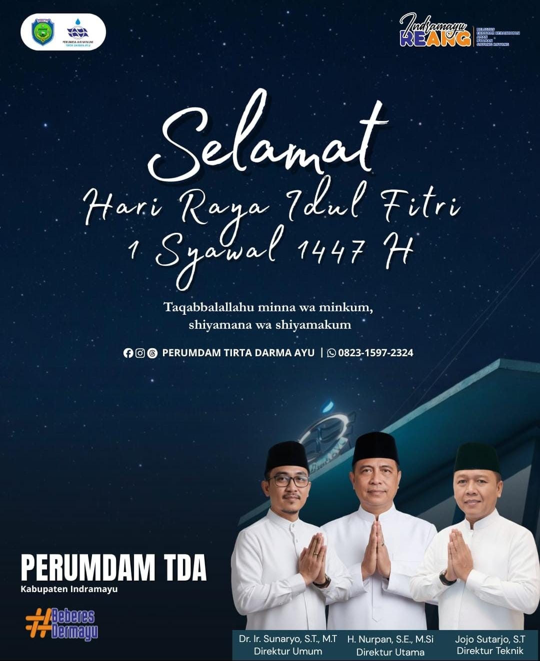 Dalam rangka menyambut Hari Raya Idul Fitri 1 Syawal 1447 Hijriah atau tahun 2026 Masehi, H.Nurpan SE., M.Si Dirut (Direktur Utama) Perumdam (Perusahaan Umum Daerah Air Minum) Tirta Darma Ayu Kabupaten Indramayu menyampaikan ucapan selamat Hari Raya Idulfitri 1447 H kepada seluruh masyarakat.