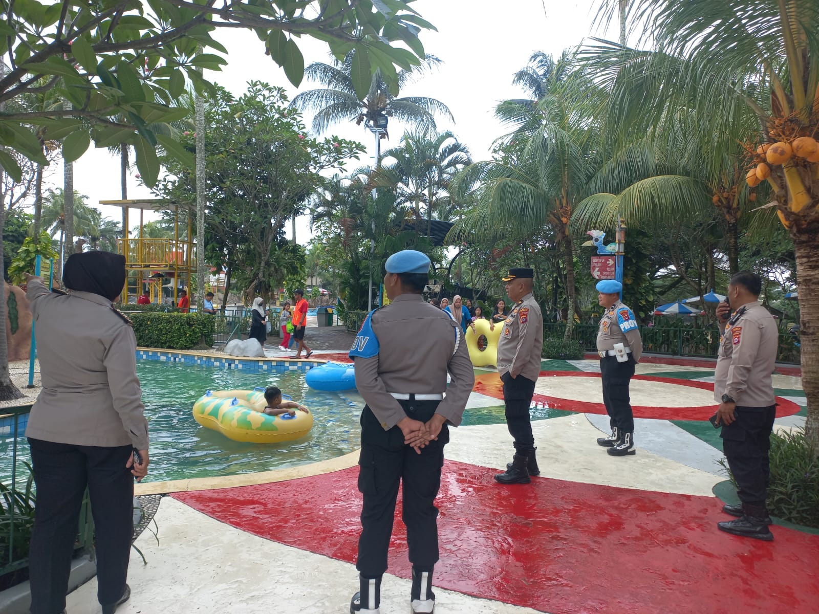Dalam kegiatan tersebut, petugas melaksanakan patroli dan monitoring di area wisata, sekaligus memberikan imbauan kamtibmas kepada para pengunjung agar tetap menjaga keselamatan dan ketertiban selama beraktivitas.Berdasarkan hasil pemantauan, jumlah pengunjung di Kolam Renang Water World Citra Raya diperkirakan mencapai sekitar 300 orang.