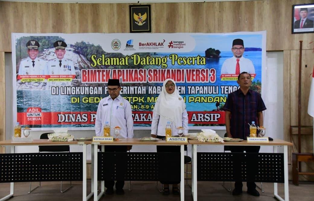Sebelumnya Kadis Perpustakaan dan Arsip Tapteng Dr. Samrul Bahri Hutabarat, S.Ag, M.Pd Kegiatan Bimtek Srikandi Versi 3 ini dilaksanakan selama 2 hari, yaitu Bimtek khusus OPD Tapteng pada 8 April 2026 dan Bimtek khusus Kecamatan se Tapteng pada 9 April 2026 dengan Narasumber sebagai Instruktur Utama dari ANRI dan Dinas Perpustakaan dan Arsip Provinsi Sumatera Utara, Instruktur Pembantu dari Dinas Perpustakaan dan Arsip Tapteng, Dinas Kominfo Tapteng, dan BKPSDM Tapteng, yang didukung kesiapan Sertifikat Elektronik dari Tim Verifikator Sertifikat Elektronik Dinas Kominfo Tapteng.