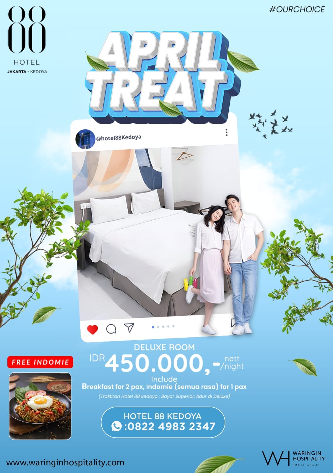 Promo utama “April Treat” berlaku sepanjang bulan April 2026, sedangkan promo Kopi & Roti Bakar berlaku hingga 3 bulan ke depan. Informasi lebih lanjut dapat dilihat di Instagram @hotel88kedoya. (*/Red)